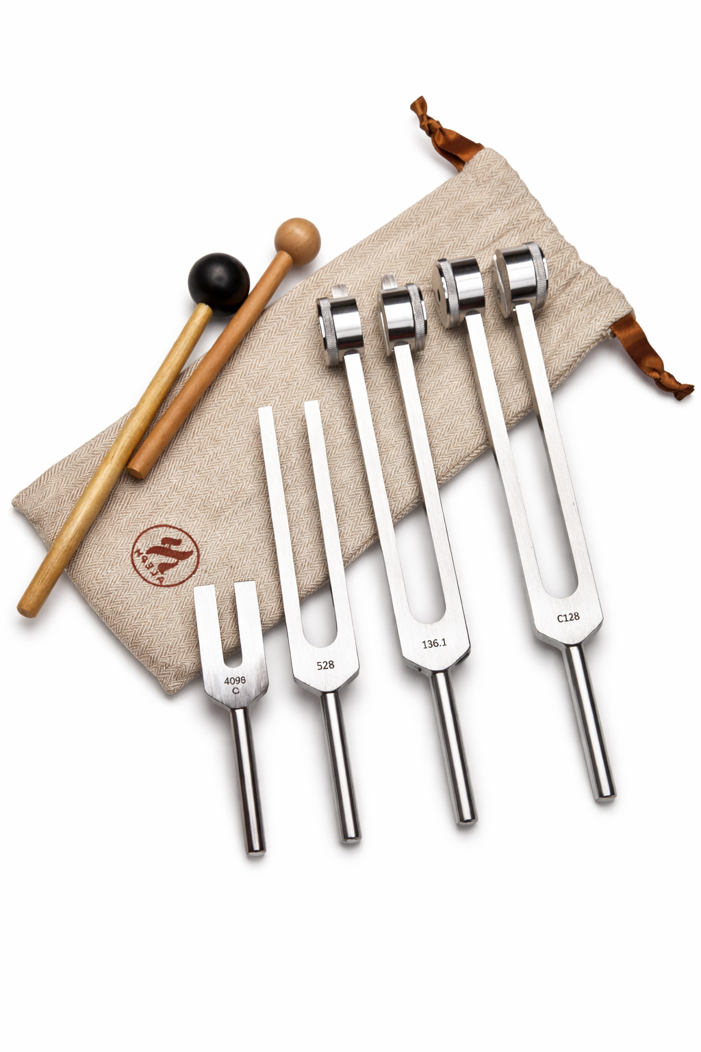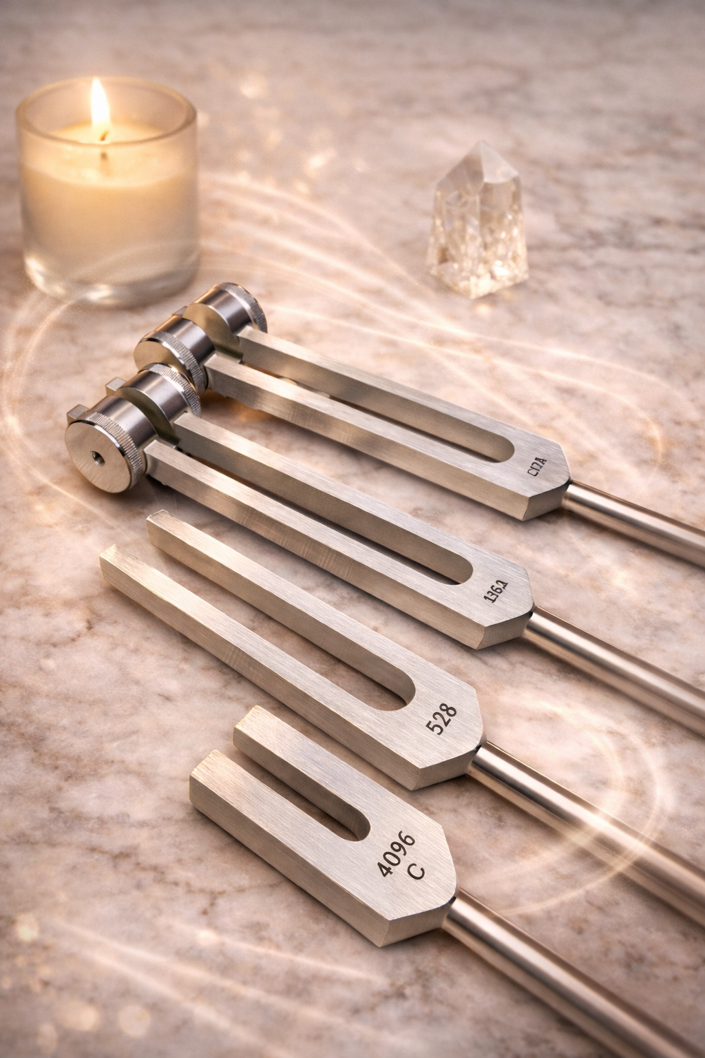 The 4 Basic Tuning Fork Set brings together four complementary frequencies — 136.1 Hz, C128, 528 Hz and C4096 Hz — offering a balanced foundation for beginners exploring resonance, regulation and self-awareness through sound.
